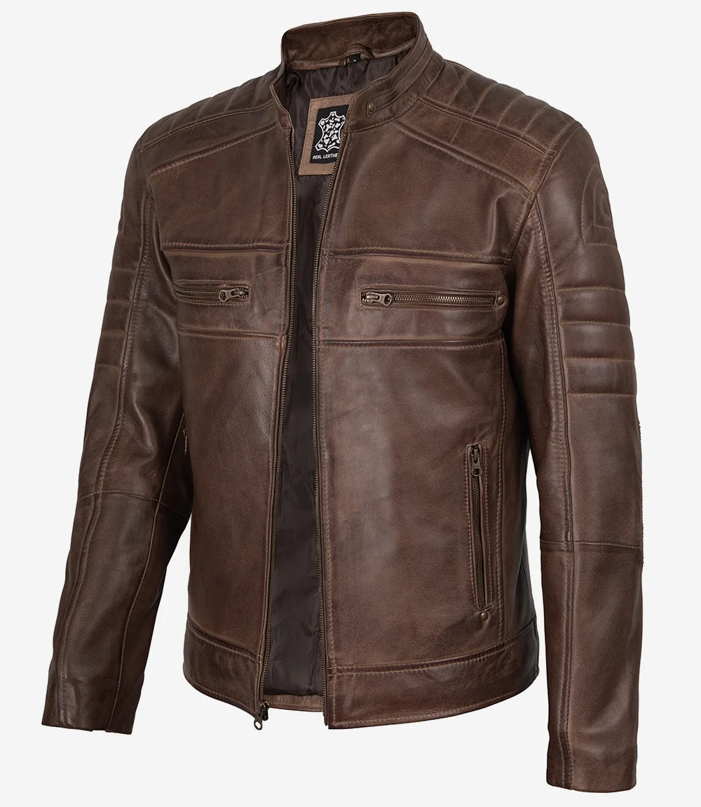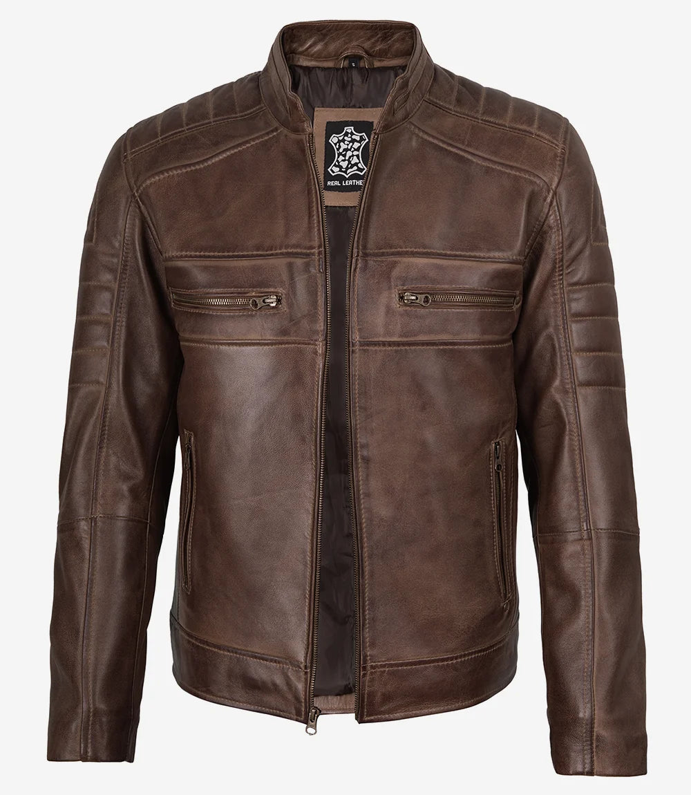 Men's Coffee Brown Distressed Leather Biker Jacket