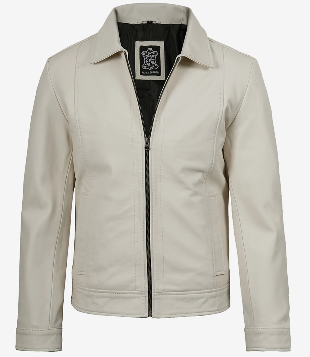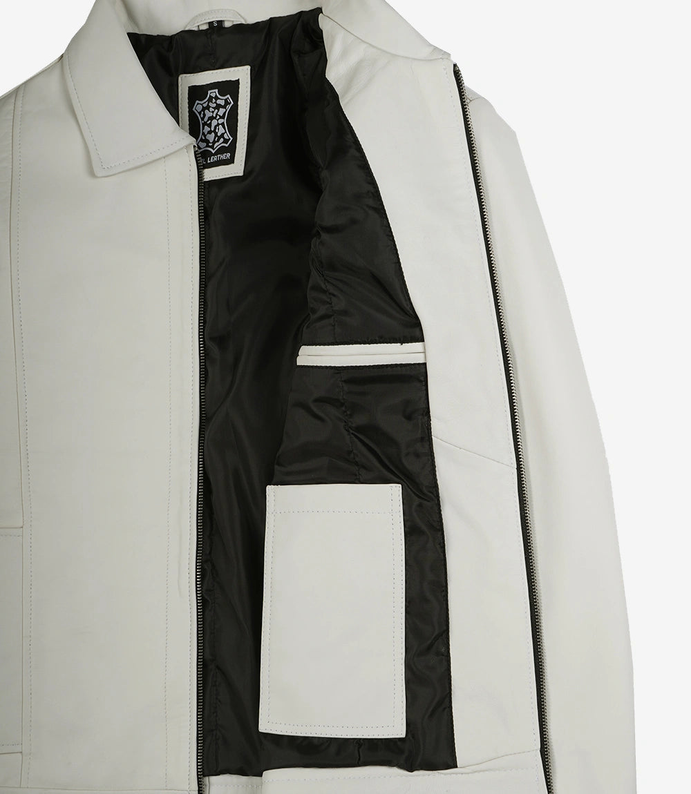 Elevate your wardrobe with our Men's Off-White Harrington Leather Jacket, crafted from 100% real lambskin for unparalleled quality and comfort. This modern piece features a soft polyester lining, ensuring a perfect fit for both casual outings and stylish transitions through the seasons. The shirt collar and convenient zip closure add a touch of sophistication, while the spacious pockets provide utility for your everyday essentials.
