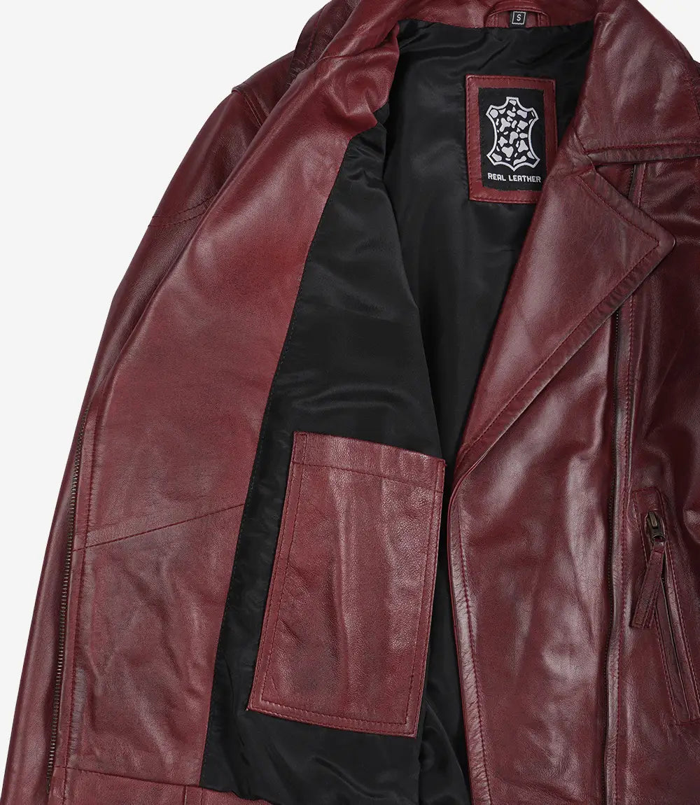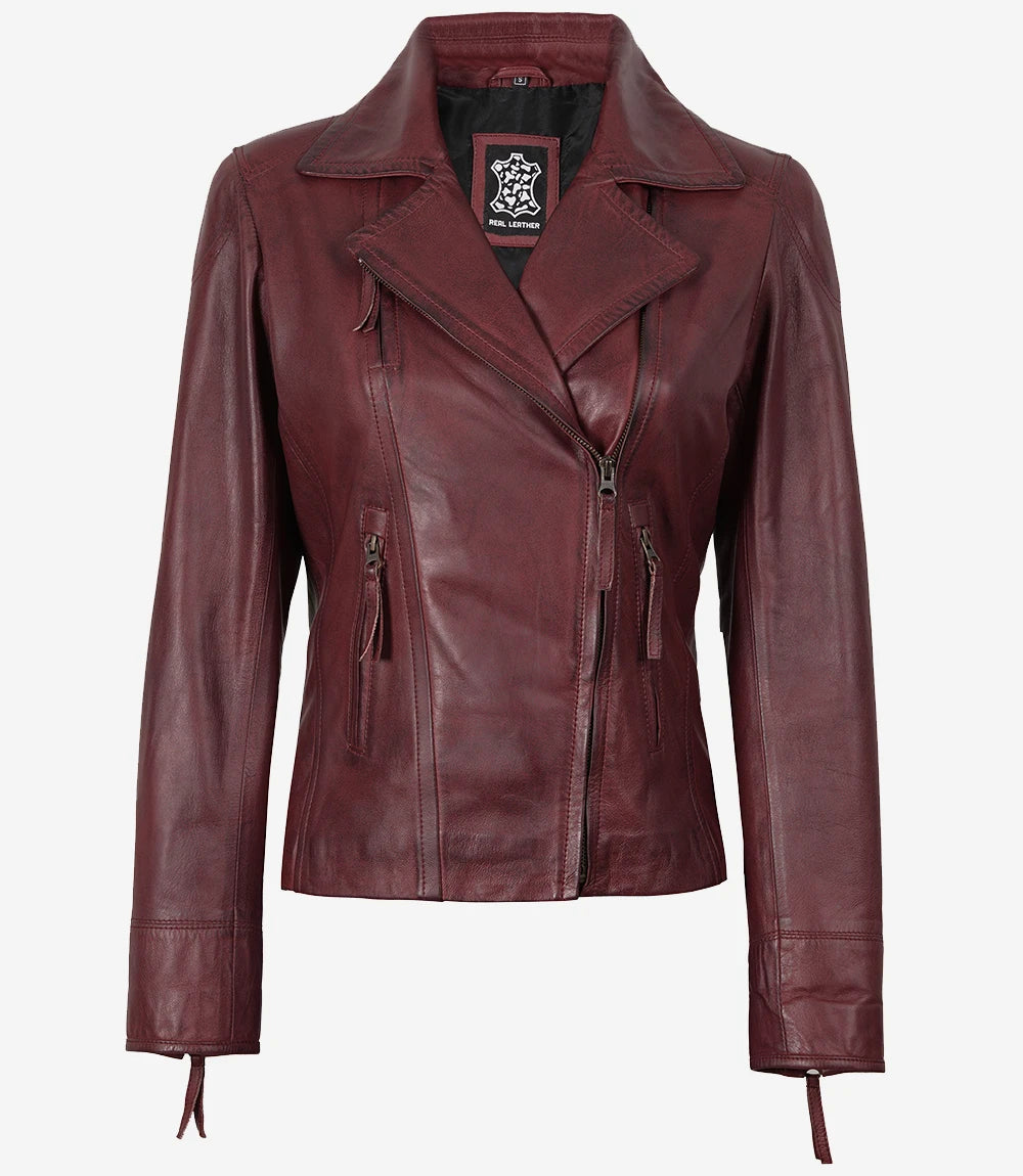 Elevate your style with our Women's Burgundy Lambskin Leather Biker Jacket, crafted from 100% real lambskin leather for a luxurious feel. This modern biker jacket features a flattering fit, making it ideal for both casual outings and edgy fashion statements. Lined with soft polyester, it ensures comfort through every season while the asymmetrical zip closure and multiple pockets provide both utility and chic appeal.