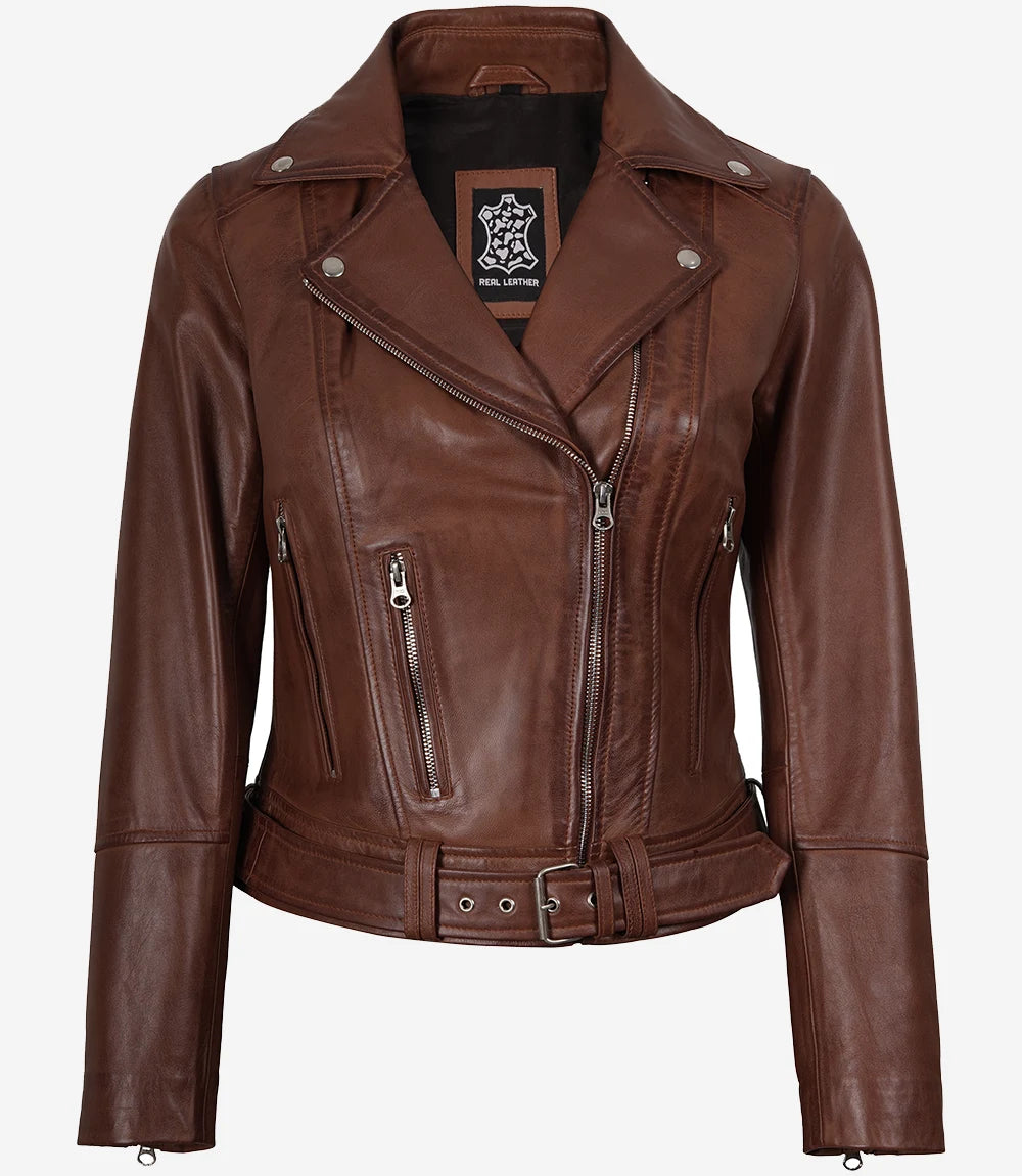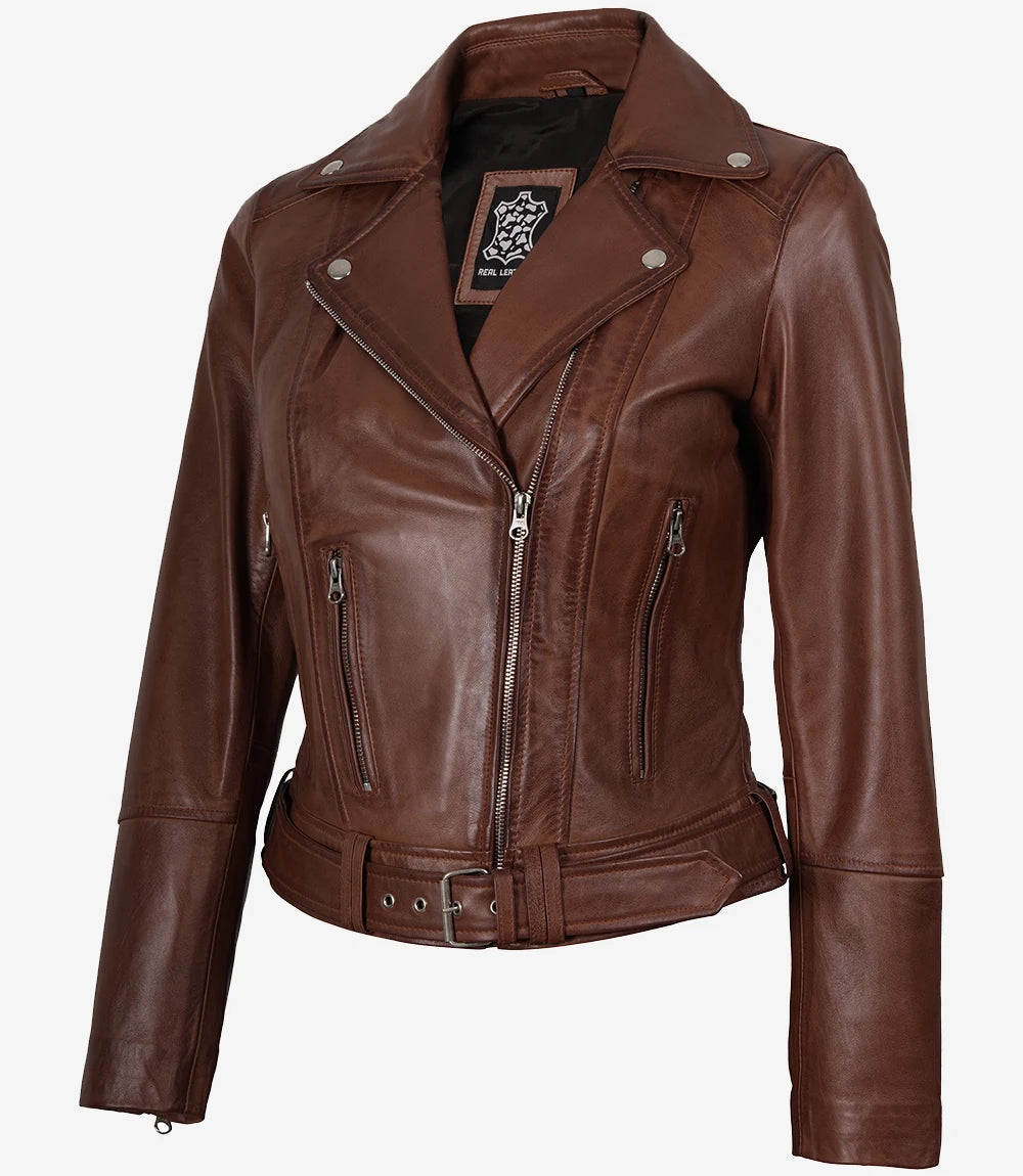 Women's Cognac Leather Jacket - Asymmetrical Biker Style with Belted Waist
