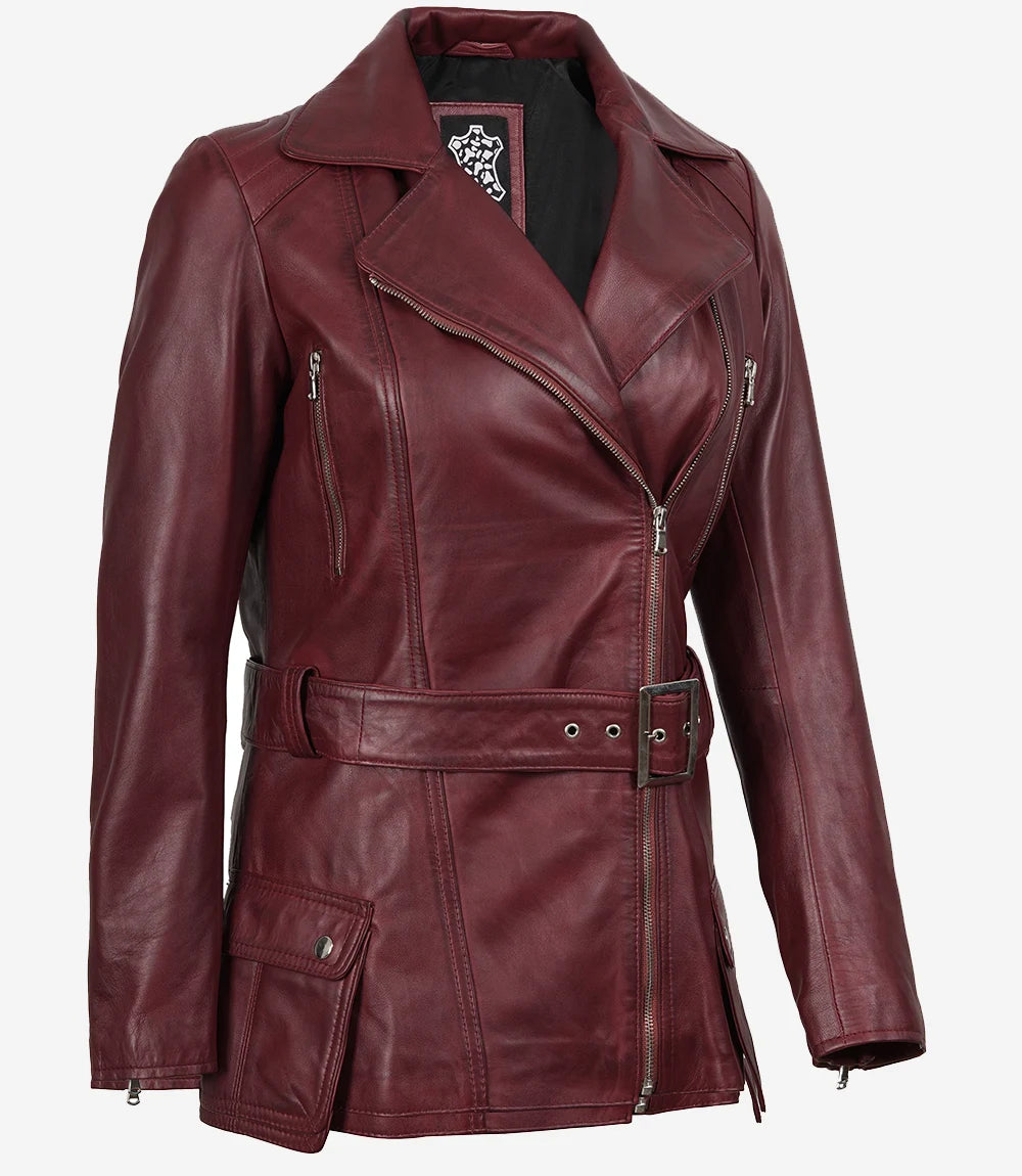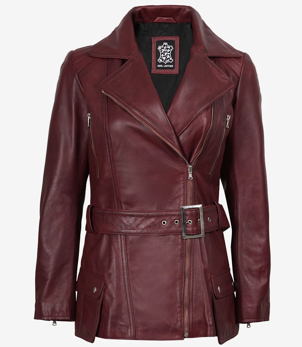 Women's Maroon Leather Biker Jacket with Asymmetrical Belted Front