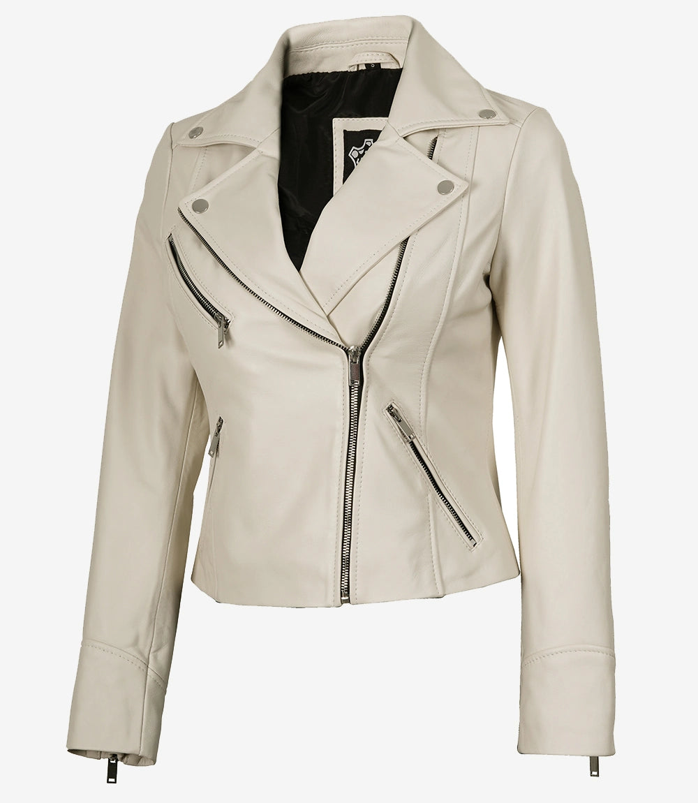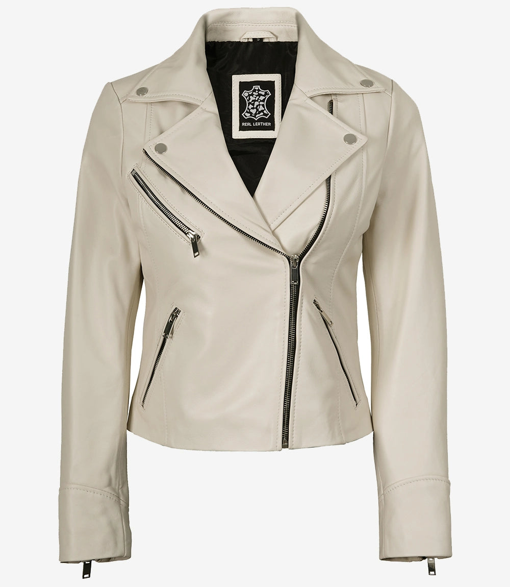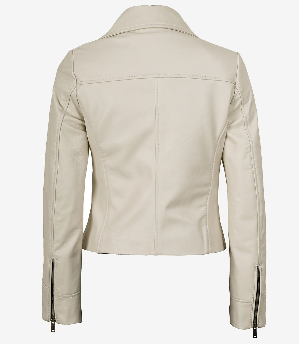 Discover the epitome of modern elegance with our Women's Off White Lambskin Leather Jacket, expertly crafted from 100% genuine lambskin leather. This premium biker-style jacket features a tailored fit that flatters any silhouette, making it ideal for both casual outings and sophisticated events. With its soft polyester inner lining and three practical pockets, this jacket seamlessly transitions through the seasons while adding a touch of luxury to your wardrobe.