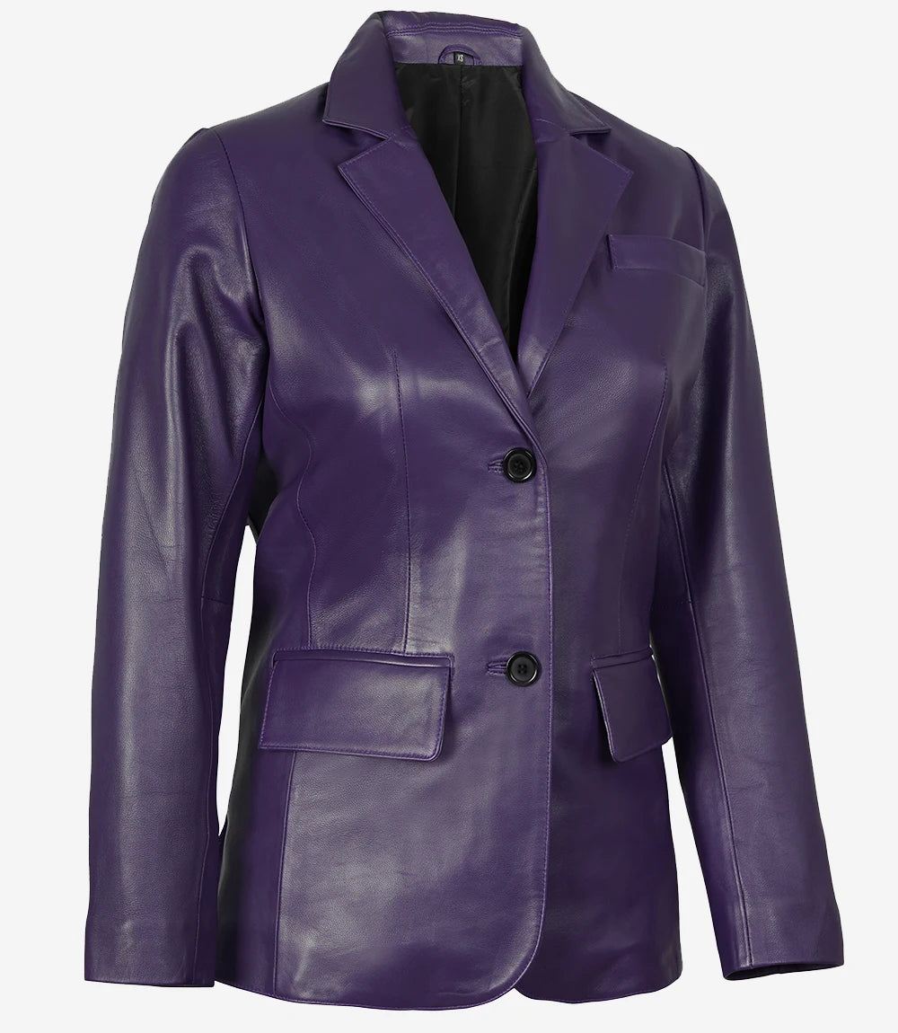 Elevate your wardrobe with our Women's Purple Leather Blazer, expertly crafted from 100% lambskin leather and featuring a soft polyester lining for a luxurious feel. This modern, tailored blazer showcases a notch lapel and a two-button closure, providing a flattering fit perfect for any occasion. Ideal for transitional seasons, it effortlessly pairs with both formal and casual attire, making it a versatile staple in your fashion collection.