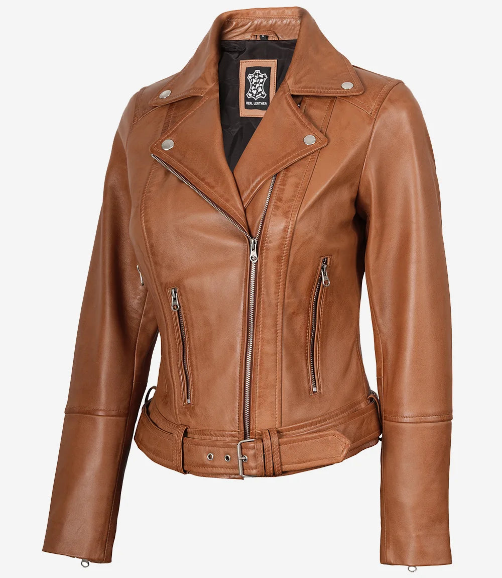 Women's Tan Leather Biker Jacket with Asymmetrical Cut and Belted Waist