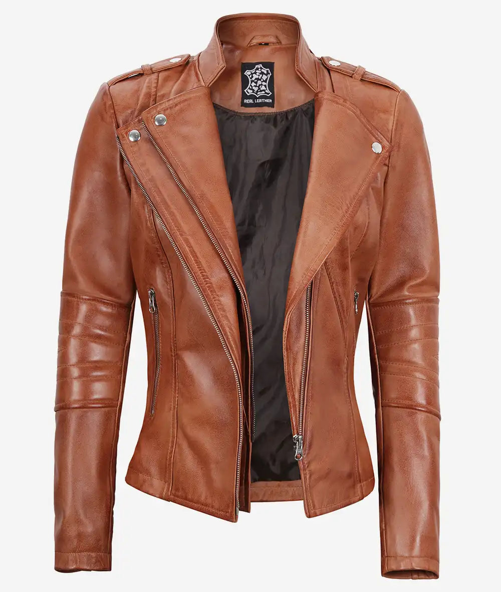Women's Tan Leather Jacket with Asymmetrical Biker Style